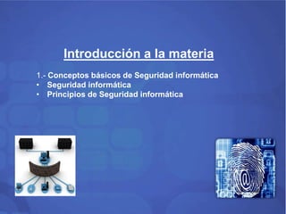 Este documento presenta una introducción a los conceptos básicos de seguridad informática. Explica que la seguridad informática se refiere a los procedimientos, dispositivos y herramientas para asegurar la integridad, disponibilidad y privacidad de la información en un sistema. También cubre los principios clave de la seguridad informática como la confidencialidad, integridad y disponibilidad, así como los objetivos de proteger la información, infraestructura y usuarios. Además, define términos relacionados como amenazas, at