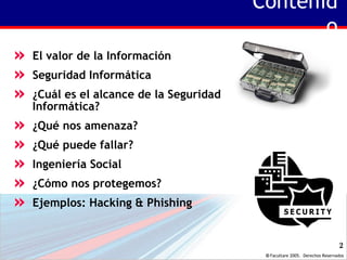 El documento trata sobre la protección de activos de información y la seguridad informática. Explica que los datos son valiosos para generar información y conocimiento, y por lo tanto deben protegerse. Describe las amenazas como fallas de hardware, software, redes o personas, así como ataques como hacking e ingeniería social. Finalmente, recomienda diseñar políticas y procedimientos de seguridad, educar a los usuarios, e implementar herramientas para reducir riesgos.