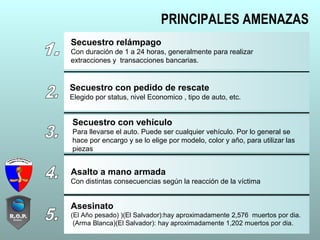 El documento ofrece directrices sobre cómo mantener la seguridad personal en áreas de alto riesgo, abordando amenazas como el secuestro y el asalto. Se destacan estrategias de prevención y acción en caso de ataque, enfatizando la importancia de la observación y el mantenimiento de distancia con sospechosos. Se proporciona un conjunto de reglas a seguir durante situaciones potencialmente peligrosas para minimizar riesgos y aumentar las probabilidades de una reacción adecuada.