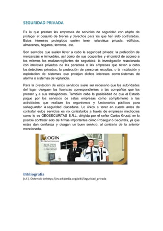 La seguridad privada protege los bienes y derechos privados de individuos y empresas mediante servicios como vigilancia, investigación privada, protección de personas y alarmas. Estos servicios suelen requerir licencias y pueden ser contratados por el Estado como complemento a la seguridad pública, excepto de empresas mediocres.