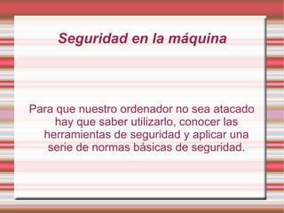 El documento habla sobre la seguridad en las personas y máquinas al usar Internet. Explica las amenazas como virus, gusanos, hackers, spam y phising, y cómo protegerse de ellas utilizando programas de control parental, no compartir información personal con desconocidos, y denunciar cualquier contenido inapropiado. También recomienda hablar con los padres sobre seguridad en Internet y limitar el tiempo en línea.