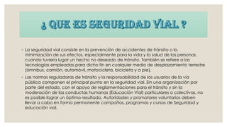 La seguridad vial depende de la participación armónica de los conductores, peatones, vehículos y carreteras. Requiere que los usuarios conozcan y cumplan las leyes de tránsito, y que los vehículos y carreteras estén en buen estado. Los principales objetivos de las leyes de tránsito son proteger vidas humanas, desarrollar medidas de seguridad, y educar a los ciudadanos para mejorar el comportamiento en las carreteras.