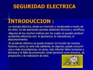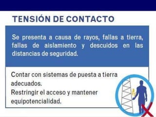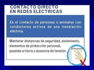 Este documento trata sobre seguridad eléctrica. Explica los principales riesgos eléctricos como contactos directos e indirectos con la electricidad y define conceptos básicos como tensión, resistencia y circuito. También describe medidas de protección como la puesta a tierra, interruptores diferenciales y equipos de protección personal. Por último, proporciona indicaciones sobre los primeros auxilios en caso de accidente eléctrico.