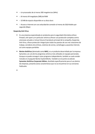 El documento proporciona una descripción general de varios antivirus populares como AVG, NOD32, Kaspersky Anti-Virus y Norton AntiVirus. Describe sus principales funciones como escaneos periódicos, detección de virus, protección contra malware, velocidad, uso de recursos y precios.