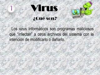 Este documento trata sobre los virus informáticos, incluyendo su historia, tipos, efectos, formas de propagación, y métodos de protección. Explica que los virus son programas maliciosos que infectan otros archivos y pueden ser destructivos o no destructivos. También describe programas espía, spam, phishing y otras amenazas cibernéticas comunes, así como herramientas de seguridad como antivirus, cortafuegos y copias de seguridad para protegerse.
