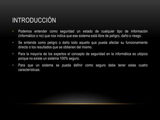 Este documento describe conceptos clave relacionados con la seguridad informática. Define seguridad como un estado libre de peligro, daño o riesgo. Para que un sistema se considere seguro, debe cumplir con integridad, confidencialidad, disponibilidad e irrefutabilidad. Luego discute términos como activo, amenaza, vulnerabilidad y riesgo. Finalmente, describe medidas comunes de seguridad como parches, antivirus, cortafuegos y software antispyware.