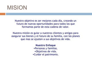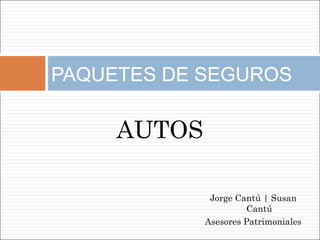 Este documento presenta información sobre paquetes de seguro de autos ofrecidos por la empresa C&S Asesores Alfa. La empresa se enfoca en asesorar a personas y familias para cuidar su patrimonio y alcanzar sus objetivos de vida a través de planes de seguro ajustados a sus necesidades. Se describen cuatro paquetes de seguro de autos - Amplio Plus, Amplio, Limitado y Básico - que varían en las coberturas incluidas. La empresa ofrece ventajas como renovación automática, auto sustituto en caso de pérd
