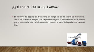 Este documento describe los seguros de carga, que cubren las mercancías durante su transporte desde el almacén del proveedor hasta su destino final. Explica que compañías como Generali, Sura, ASSA y Mapfre ofrecen este seguro en Panamá, e identifica los tipos de pólizas como terrestres, flotantes e individuales. Además, detalla los tipos de mercancía permitidos y los requisitos para obtener un seguro de carga, como el nombre del cliente, tipo de mercancía y países de destino.