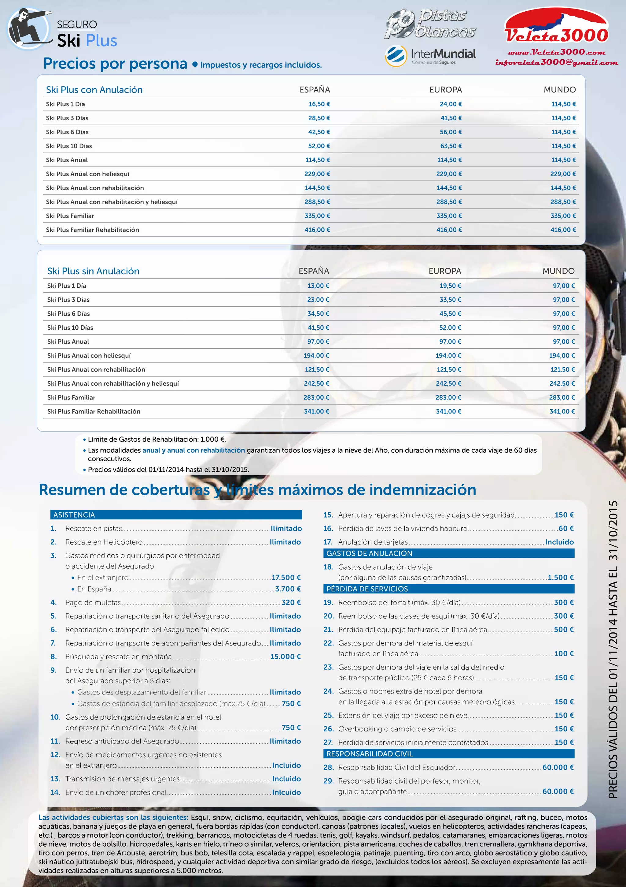 Seguro para tus viajes de Esquí y Snow... Seguro Ski Plus Las actividades cubiertas son las siguientes: Esquí, snow, ciclismo, equitación, vehículos, boogie cars conducidos por el asegurado original, rafting, buceo, motos acuáticas, banana y juegos de playa en general, fuera bordas rápídas (con conductor), canoas (patrones locales), vuelos en helicópteros, actividades rancheras (capeas, etc.) , barcos a motor (con conductor), trekking, barrancos, motocicletas de 4 ruedas, tenis, golf, kayaks, windsurf, pedalos, catamaranes, embarcaciones ligeras, motos de nieve, motos de bolsillo, hidropedales, karts en hielo, trineo o similar, veleros, orientación, pista americana, coches de caballos, tren cremallera, gymkhana deportiva, tiro con perros, tren de Artouste, aerotrim, bus bob, telesilla cota, escalada y rappel, espeleología, patinaje, puenting, tiro con arco, globo aerostático y globo cautivo, ski náutico jultratubejski bus, hidrospeed, y cualquier actividad deportiva con similar grado de riesgo, (excluidos todos los aéreos). Se excluyen expresamente las actividades realizadas en alturas superiores a 5.000 metros