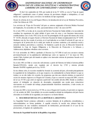 El documento describe brevemente la historia de la seguridad social en tres países de América Latina: Venezuela, Chile y Argentina. Detalla los orígenes y desarrollo de los principales organismos e instituciones de seguridad social en cada país, incluyendo hitos como la creación del Instituto Venezolano de los Seguros Sociales en 1946, la Caja de Seguro Obligatorio de Chile en 1924, y la expansión paulatina de la cobertura en Argentina. También discute reformas importantes y desafíos actuales de estos sistemas.