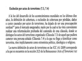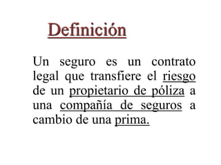 El documento define los conceptos básicos de un seguro, incluyendo que es un contrato legal que transfiere el riesgo de un propietario a una compañía de seguros a cambio de una prima. Explica que la función de un seguro es reponer al asegurado en caso de siniestro o dar una compensación económica. También describe los elementos clave de un contrato de seguro como el asegurador, asegurado, riesgos cubiertos y excluidos, y los principios de indemnización e interés asegurable.
