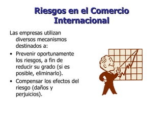 El documento describe los principales riesgos en el comercio internacional y los mecanismos que las empresas utilizan para prevenir y compensar esos riesgos, incluyendo medidas de seguridad, cláusulas en los contratos comerciales, seguros y más. Explica en detalle los contratos de seguro y sus cláusulas, coberturas y recomendaciones para asegurar adecuadamente las transacciones comerciales internacionales.