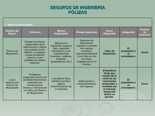 Este documento describe diferentes tipos de seguros de ingeniería, incluyendo seguros anuales para maquinaria, equipos electrónicos e instalaciones; y seguros temporales para obras en montaje, construcción de obras civiles y equipos de contratistas durante períodos específicos de instalación, montaje y pruebas. Proporciona detalles sobre los plazos de cobertura, partes aseguradas, sumas aseguradas, riesgos cubiertos y bienes asegurables para cada tipo de seguro.