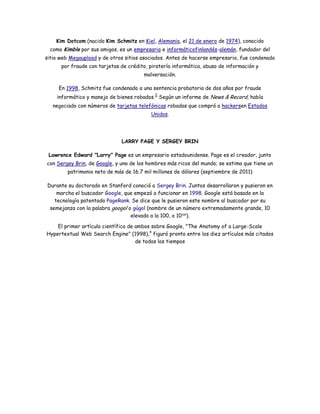 Steven Jobs fue un empresario estadounidense y cofundador de Apple Inc. Fundó Apple en 1976 con Steve Wozniak en el garaje de su casa y lideró la empresa a gran éxito, aunque fue despedido en 1985. Más tarde regresó a Apple y la convirtió en una de las empresas más valiosas del mundo. Mark Zuckerberg creó Facebook mientras estudiaba en la Universidad de Harvard y ahora es un multimillonario. Larry Page y Sergey Brin crearon el motor de búsqueda Google mientras estudiaban en la Universidad de Stanford.