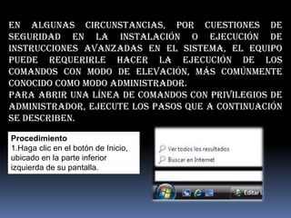 Este documento describe cómo ejecutar comandos con privilegios de administrador en Windows. Explica que a veces es necesario ejecutar comandos como administrador por razones de seguridad. Luego detalla los pasos para abrir una línea de comandos con privilegios de administrador, que incluyen buscar "cmd" en Iniciar, hacer clic derecho en el resultado y seleccionar "Ejecutar como administrador", lo que abrirá una ventana de línea de comandos con privilegios elevados.