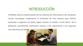 El documento presenta el Sistema Electrónico de Información en Salud (SEIS) implementado por el Ministerio de Salud para facilitar el registro y almacenamiento de datos de salud a nivel nacional. El SEIS permite que los expedientes clínicos de los pacientes sean accesibles en todos los centros de salud y automatiza procesos como el registro de datos y codificación de procedimientos para mejorar la gestión de salud y monitorear aspectos epidemiológicos.
