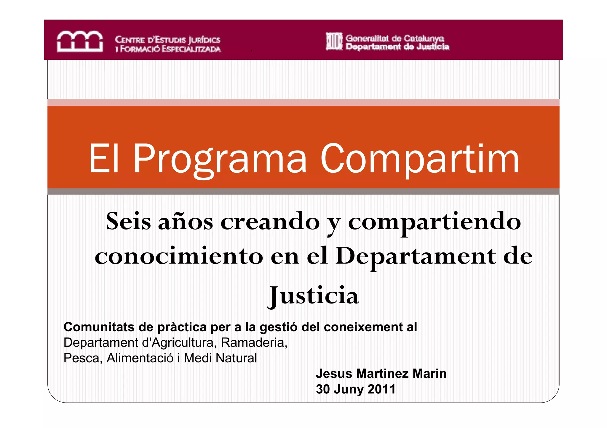 El documento describe el Programa Compartim en el Departamento de Justicia de Cataluña, el cual ha creado y compartido conocimiento a través de comunidades de práctica durante seis años. El programa involucra a 22 grupos profesionales y 25 comunidades que comparten conocimiento en línea y en persona, produciendo 25 nuevos aportes de conocimiento cada año. El programa evalúa su éxito a través de indicadores como la producción, el impacto y la calidad de los resultados.