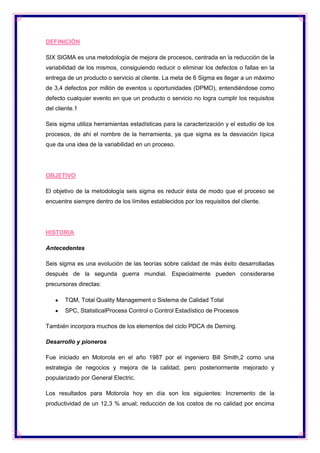 Six Sigma es una metodología para la mejora de procesos que utiliza herramientas estadísticas para reducir la variabilidad y defectos en los procesos de una organización. El objetivo es limitar los defectos a 3.4 por cada millón de oportunidades. Se desarrolló originalmente en Motorola en 1987 y ha ayudado a empresas a aumentar la productividad, reducir costos y mejorar la calidad. La metodología involucra cinco etapas clave: definir el problema, medir, analizar, mejorar y controlar.