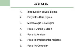 El documento presenta una introducción al sistema de gestión de calidad Seis Sigma. Explica las fases de la metodología DMAIC (Definir, Medir, Analizar, Implementar, Controlar) y los conceptos clave como CTQ, VOC y equipo Seis Sigma. La agenda incluye las fases de definición y medición del proceso, así como ejemplos de cómo identificar y priorizar los problemas desde la perspectiva del cliente.