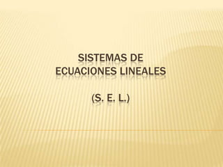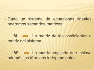 Este documento describe los sistemas de ecuaciones lineales y los métodos para resolverlos. Explica que un sistema puede ser compatible o incompatible dependiendo de si el rango de la matriz de coeficientes es igual o no al rango de la matriz ampliada. También describe los métodos de Cramer y Gauss para resolver sistemas compatibles determinados e indeterminados respectivamente.