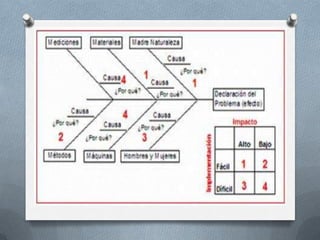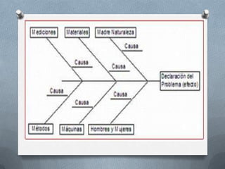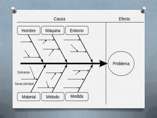 Este documento describe el diagrama de Ishikawa, también conocido como diagrama de espina de pescado. Fue concebido por el químico japonés Kaoru Ishikawa en 1943 para facilitar el análisis de problemas y sus soluciones. El diagrama representa el problema central y las posibles causas agrupadas en categorías como materiales, métodos y mano de obra. Se usa para identificar las causas raíz de un problema y determinar dónde enfocar los esfuerzos de mejora.