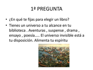 El documento anima a la lectura y ofrece consejos sobre cómo elegir libros. Pregunta sobre los factores que influyen en la elección de lectura como el género, temas, formato y fuentes de recomendación. También discute los beneficios de la lectura como el desarrollo personal y la acumulación de sabiduría a través de la historia.