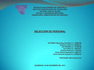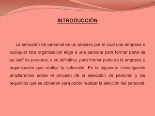 Este documento trata sobre el proceso de selección de personal en una empresa u organización. Explica que la selección de personal involucra elegir a una persona para formar parte del equipo de trabajo. Describe los objetivos, la razón de selección, los tipos de pruebas psicométricas y entrevistas que se utilizan durante el proceso de selección. Finalmente, concluye que tanto las habilidades como las motivaciones de los candidatos son importantes de considerar para tomar la mejor decisión de contratación.