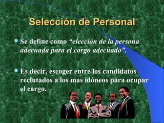 Este documento trata sobre el proceso de selección de personal. Explica que la selección de personal implica elegir al candidato más adecuado para cada puesto. Detalla las técnicas de selección como entrevistas y pruebas psicotécnicas, específicas y médicas que permiten evaluar las calificaciones de los candidatos. Finalmente, resalta las ventajas de contar con personal seleccionado adecuadamente como el éxito en la contratación y evitar costos.