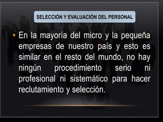 El documento trata sobre la selección y evaluación del personal. Explica que en las micro y pequeñas empresas no hay procedimientos formales para la selección, mientras que en empresas medianas y grandes sí los hay. Estos procedimientos incluyen entrevistas, pruebas de competencias y evaluaciones psicológicas para determinar el mejor candidato. También habla sobre el método de "head hunting" para perfiles directivos.