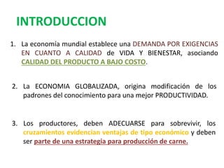 Este documento discute los beneficios de los cruces de ganado para la producción de carne. Explica que los cruces permiten una mayor ganancia de peso, precocidad productiva y reproductiva, y mejor calidad de la carne. También analiza diferentes sistemas de cruzamiento como el simple, continuo y rotacional, y concluye que aunque los cruces muestran ventajas productivas, es importante la selección de razas y el establecimiento de objetivos claros para cada sistema de producción.