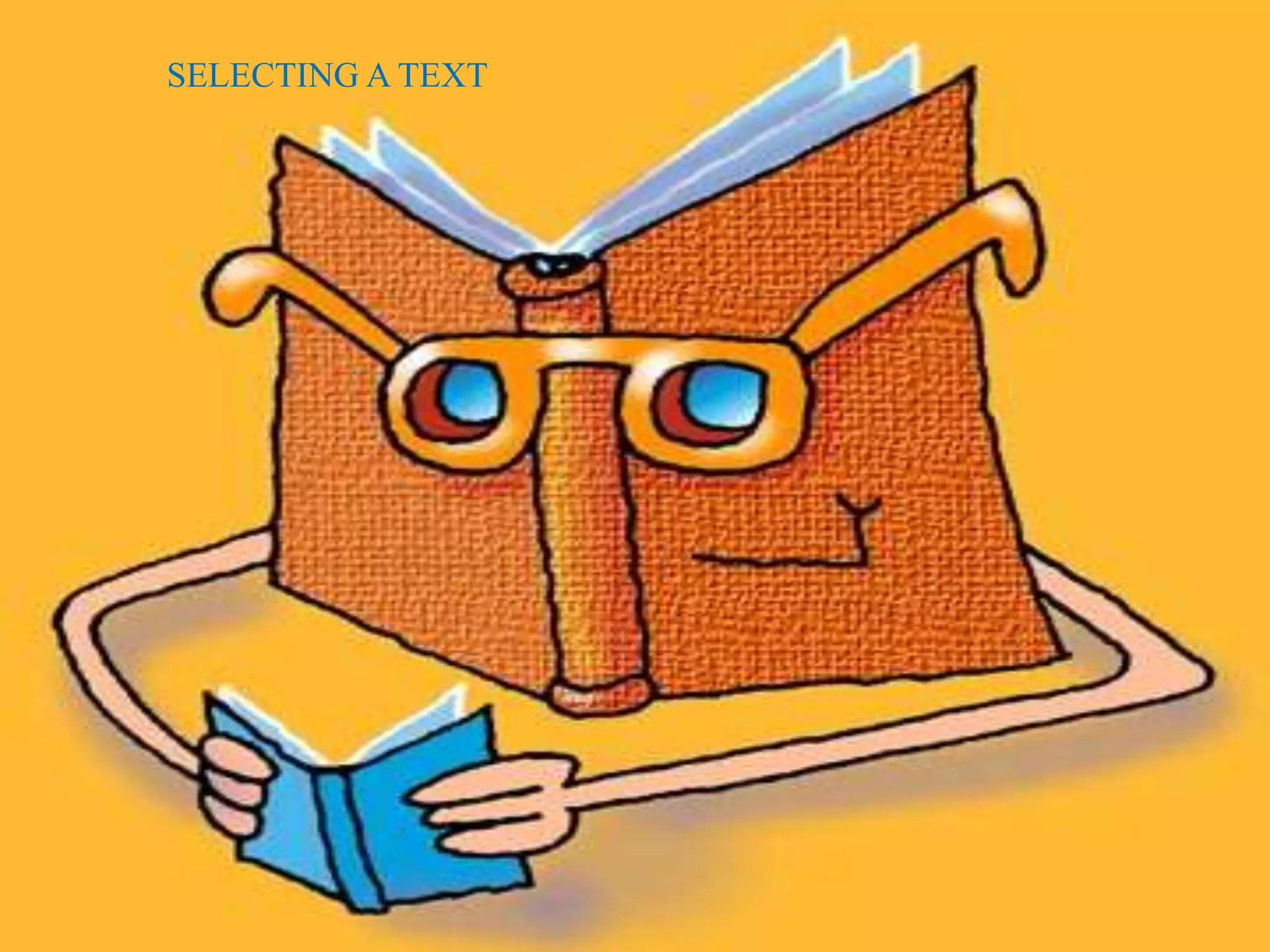Este documento describe tres puntos clave para seleccionar un texto apropiado para los estudiantes. 1) El texto debe estar de acuerdo con el nivel de los estudiantes y dar práctica en habilidades de lectura específicas. 2) Debe ir acompañado de preguntas o ejercicios bien concebidos relacionados con la próxima actividad. 3) Se debe considerar la legibilidad, el contenido adecuado y si el material puede ser explotado de manera efectiva.