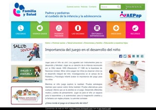 El juego es fundamental para el desarrollo integral de los niños, reconocida como un derecho de la infancia que promueve la creatividad, la socialización y la expresión emocional. A través del juego, los niños exploran la realidad, desarrollan habilidades motoras y cognitivas, y aprenden a establecer interacciones sociales. Es vital que los padres fomenten el juego como medio de aprendizaje y disfrute, adaptándolo a la edad y el desarrollo del niño.