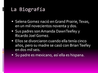 Selena Gomez nació en 1992 en Texas y comenzó su carrera a los 7 años en programas de televisión. Se hizo famosa interpretando a Alex Russo en la serie de Disney Channel "Hechiceros de Waverly Place". Actualmente protagoniza películas y tiene una exitosa carrera musical con su banda Selena Gomez & the Scene. Además sale con el cantante Justin Bieber.
