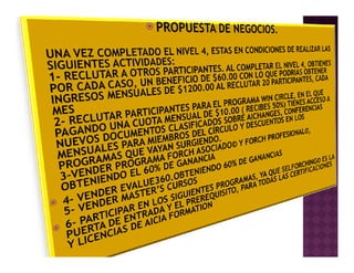 El documento presenta información sobre el desarrollo personal y el liderazgo interior. Habla de diferentes niveles de poder personal y competencias como la proactividad, el compromiso y el enfoque para lograr resultados. También describe elementos de la identidad, la misión, la visión y la estrategia para alcanzar objetivos. Finalmente, propone un proceso de cuatro niveles para adquirir competencias como formador de liderazgo interior a través de lectura, participación en programas y entrenamiento práctico como tutor.