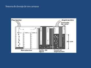 El documento describe el procedimiento de colocación de un tubo pleural para drenar líquido o aire del espacio pleural o mediastino. El objetivo es mantener un sistema cerrado unidireccional con presión negativa. Se explica la anatomía de la pleura, el material requerido como el sello de agua, y los pasos del procedimiento como la punción, inserción del catéter y conexión al sello de agua. También se detallan los cuidados posteriores como prevenir el edema de reexpansión y mantener el sistema cerrado y permeable