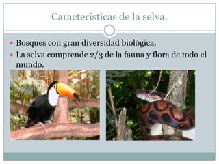 La selva se caracteriza por su gran diversidad biológica, albergando 2/3 de la fauna y flora mundial. La selva amazónica es la más extensa del planeta y contiene la mayor biodiversidad de plantas y especies. La selva Lacandona también tiene gran diversidad de especies, algunas en peligro de extinción, mientras que la selva Paranaense mantiene la mayor cantidad de remanentes forestales y atrae turistas a las Cataratas del Iguazú.