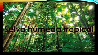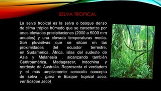 La selva tropical es un ecosistema con altas precipitaciones, temperaturas constantes y gran diversidad de especies. Representa el mayor ecosistema en extensión y alberga más de la mitad de las especies del mundo a pesar de ocupar menos del 7% de la tierra. Los suelos son húmedos y ácidos debido a la descomposición de material orgánico y lavado de minerales.