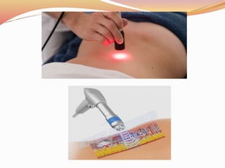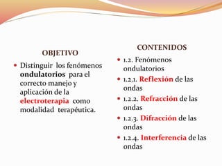 Este documento describe los principales fenómenos ondulatorios como la reflexión, refracción, difracción e interferencia y cómo afectan las ondas electromagnéticas y ultrasónicas cuando se aplican al cuerpo humano para electroterapia. También explica brevemente los tipos de láseres utilizados en fisioterapia y la colocación de electrodos para corrientes interferenciales.