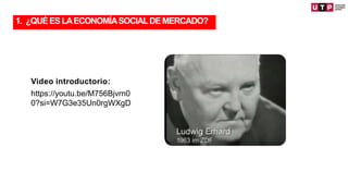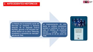 La economía social de mercado surgió en Alemania después de la Segunda Guerra Mundial como una alternativa al capitalismo y al socialismo. Se basa en una economía de mercado con intervención estatal para corregir fallas del mercado y promover la cohesión social. El Estado establece reglas para asegurar la competencia, pero también ofrece subsidios y servicios públicos para promover el bienestar general. La economía social de mercado busca lograr un equilibrio entre libertad de mercado, responsabilidad individual y justicia social.