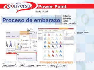 El documento describe cómo cambiar el estilo, relleno y efectos de texto en WordArt en PowerPoint. Explica cómo seleccionar el texto WordArt y modificar su estilo visual, agregar rellenos degradados, texturas o imágenes, y aplicar efectos de texto. También invita al lector a practicar convirtiendo los títulos de presentaciones en WordArt.