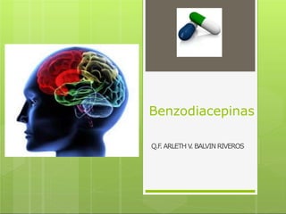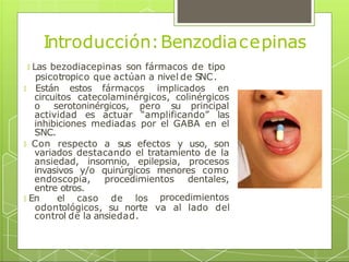Este documento resume las características principales de las benzodiacepinas. Actúan como depresores del sistema nervioso central al amplificar la inhibición mediada por el GABA. Se usan para tratar la ansiedad, insomnio, epilepsia y procedimientos médicos menores. Su mecanismo de acción implica unirse a receptores separados pero contiguos a los receptores de GABA, lo que intensifica la inhibición neuronal. Pueden causar dependencia si se usan a largo plazo o en dosis altas.