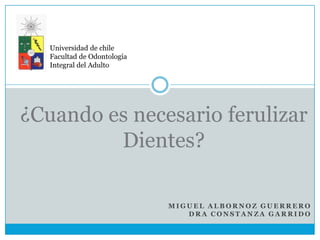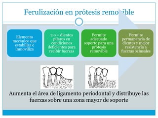 Este documento discute cuando es necesario ferulizar dientes en prótesis removibles. Explica que la ferulización aumenta el área de ligamento periodontal y distribuye las fuerzas sobre una mayor zona de soporte, permitiendo mejor soporte para la prótesis y preservando los dientes. Se recomienda ferulizar dientes débiles o mal alineados que sirven como pilares para prótesis parciales removibles. También se discuten algunas consideraciones como no ferulizar dientes con menos del 50% de soporte óseo y que incluir un