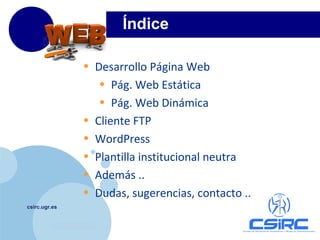 Este documento proporciona información sobre cómo crear y administrar páginas web en la Universidad de Granada. Explica dos tipos de páginas web: estáticas, que se crean con un editor de páginas web y se almacenan en un servidor FTP, y dinámicas, que requieren aplicaciones como WordPress, Joomla o Drupal. También cubre temas como el uso de plantillas institucionales, widgets y cómo configurar WordPress. El documento concluye dando detalles de contacto en caso de tener dudas.