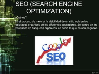 El documento habla sobre temas relacionados con el diseño web como SEO, SEM, Google Analytics y analítica web. SEO se refiere a mejorar la visibilidad orgánica de un sitio web, SEM usa herramientas para optimizar la visibilidad a través de motores de búsqueda, y Google Analytics y analítica web miden el tráfico y comportamiento de los usuarios en un sitio para optimizarlo.