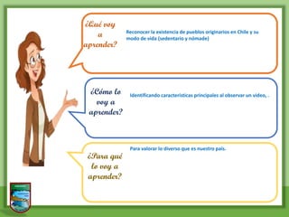 El documento habla sobre una lección sobre los pueblos originarios de Chile. La lección invita a los estudiantes a observar una imagen e imaginar la vida de los pueblos originarios antes de la llegada de los españoles. Luego, les pide ver un video para comparar los modos de vida nómada y sedentario de diferentes pueblos. Finalmente, les pide completar una autoevaluación sobre lo que aprendieron.