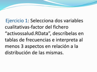 Este documento describe un ejercicio para seleccionar y analizar dos variables cualitativas de un conjunto de datos sobre actividades de salud. Las variables seleccionadas son "hacer la cama" y "hacer de comer", y se muestran sus tablas de frecuencias. Luego, se comparan los porcentajes de cada variable para interpretar tres aspectos: los estudiantes colaboran más en hacer su cama que en cocinar; una proporción mayor nunca hace de comer que nunca hace su cama; y esto podría deberse a las diferencias en dificultad y