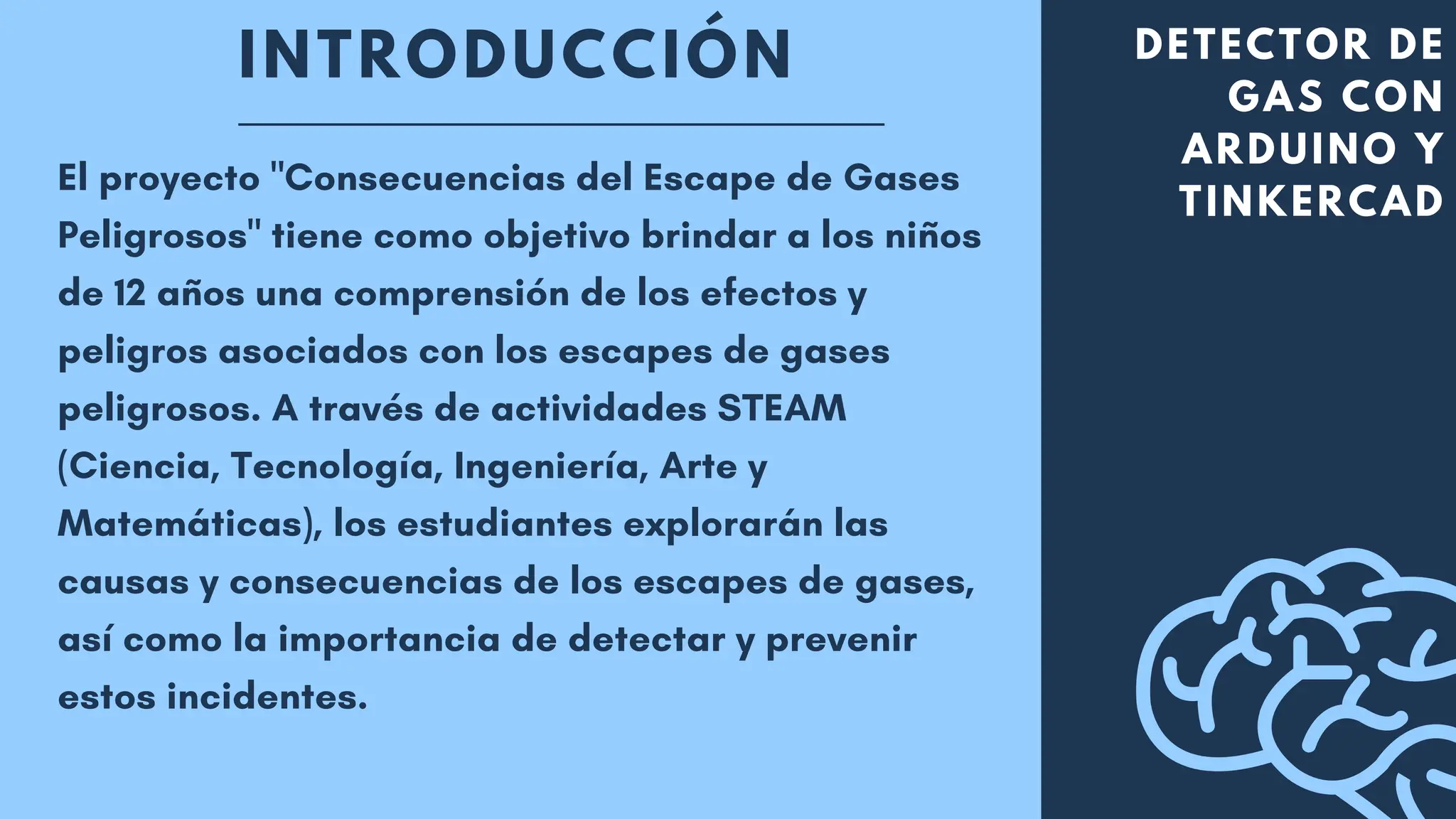 El proyecto 'Detector de gas con Arduino y Tinkercad' busca enseñar a niños de 12 años sobre los riesgos de los escapes de gases peligrosos a través de actividades STEAM. Los estudiantes aprenderán a diseñar un sistema de detección de gas utilizando Arduino, promoviendo habilidades de pensamiento crítico y trabajo en equipo. Este enfoque multidisciplinario fomenta la conciencia sobre la salud y el medio ambiente, mientras los jóvenes desarrollan un proyecto práctico en electrónica y programación.