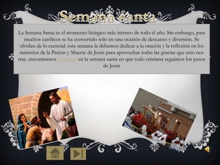 La Semana Santa conmemora los misterios de la Pasión y Muerte de Jesús a través de diversas celebraciones litúrgicas. Comienza con el Domingo de Ramos y termina con el Domingo de Pascua. Durante esta semana, los católicos deben dedicarse a la oración y reflexión para acompañar a Jesús en su sacrificio y así poder resucitar espiritualmente con él.