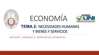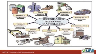 Este documento presenta una introducción a las necesidades humanas, los bienes y los servicios. Explica que las necesidades humanas son sensaciones de carencia material o inmaterial que el hombre debe satisfacer para su subsistencia. Define los bienes como cualquier cosa que puede satisfacer una necesidad y clasifica los bienes en bienes libres y bienes económicos. Finalmente, define los servicios como actividades que satisfacen necesidades de terceros de forma directa e inmaterial.