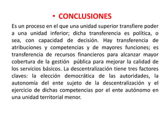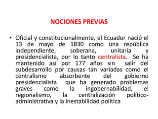 La descentralización implica transferir competencias y recursos del gobierno central a los gobiernos locales para mejorar la calidad de los servicios públicos. Ecuador ha sido un país centralizado durante 177 años, lo que ha generado problemas como la ingobernabilidad y el subdesarrollo. En las últimas décadas se han dado pasos hacia la descentralización a través de reformas constitucionales y leyes que fortalecen a los gobiernos locales. Sin embargo, para que la descentralización sea efectiva en combatir la pobreza, es necesario transferir recursos a